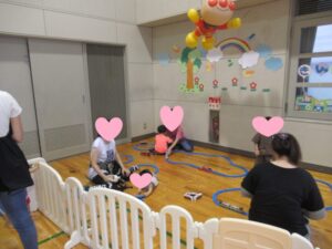 プラレールで遊ぶのをとても楽しみにしていて、早くから来館してくれました。大きなトミカも同じく大人気です。