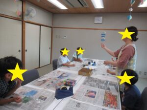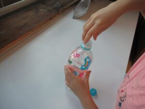 今回は、ビー玉コロコロ落としを作りました。あらかじめペットボトルを3等分しているものに厚紙で仕切りを作り、ビー玉の通し口を開けてカラーペンでお絵描きをし、ビニールテープを使って元通りに組み立て、ビー玉を入れて遊ぶものです。イメージをふくらませて黙々と作ってくれていました。