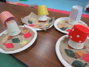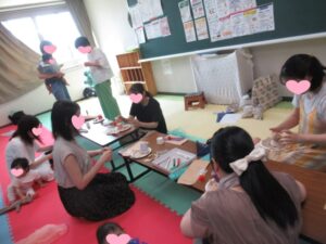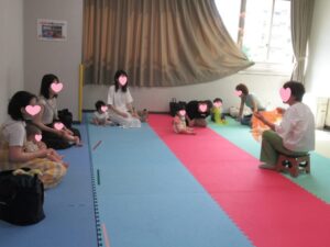 赤ちゃんたちが集まってくれました。みんな終始ニコニコご機嫌でした。わらべうたでふれあい遊びをして、シフォンの布で遊びました。ママたちにはきのこ製作に挑戦してもらいました。ちょっと大変だったけどかわいいユラユラきのこが完成しましたよ!お子さんと楽しいひとときを過ごしてもらえました。