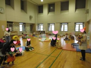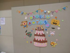 誕生会とハロウィンが重なり、誕生会も少しだけハロウィン仕様でのお祝いとなりました。かわいく仮装したお友だちもいました。たくさんのお友だちが来てくれていたので、みなさんでお祝いできました。カードをもらって、ハロウィン仕様の壁面かざりでハイ!ポーズ!記念写真も撮りました。みんなみんなおめでとう!元気で大きくなーれ!
