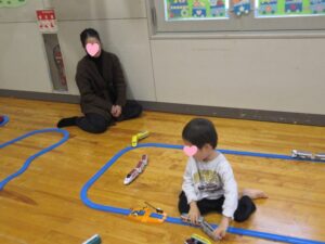 いつも大人気のプラレールの日です。お気に入りの車両を見つけてはレールに走らせています。また、レールマットの上で手でプラレールや大きいトミカを押して動かし、思い思いの走らせ方をして楽しく遊んでいました。