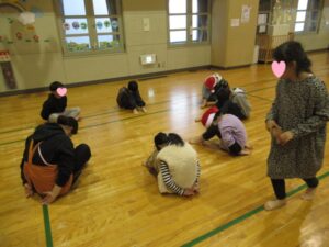 紙皿と毛糸を使ってツリーを作り、終わった児童からハンカチおとしをしました。ツリーづくりでは何度もやり直しながらも集中して取り組めていました。最後はビンゴをしました。番号が読み上げられるたびに声が上がり、盛り上がりました。