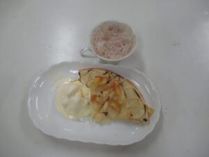 りんごのピザ・ホットミロを作りました。3人グループに分かれて、声を掛け合い協力して作業を行いました。最後は緊張もとれ、グループでおいしそうに食べていました。