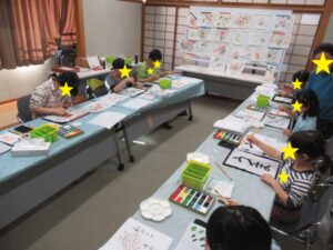 先生の作品の中から好きなものを選び、それを手本にして描きました。色の混ぜ方・書の書き方・ブラシと網を使ったスパッツタリングを教えてもらい、力作ができあがりました。
