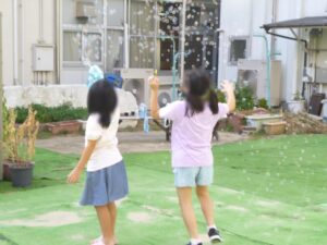 プラザの庭で「シャボン玉であそぼう!」を開催しました。