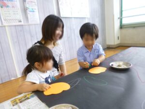 今月は、ハロウィンにちなんで黒い模造紙に描いてみました!