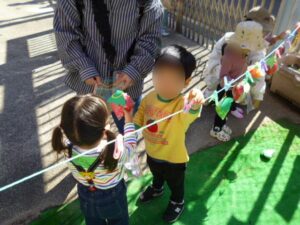 その後は、ちょっとした運動あそび。新聞紙をびりびり破いてしっぽを作ってしっぽとりゲーム。