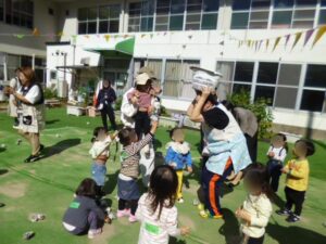 しっぽとりの次はその新聞紙をコロコロ丸めてボールを作って玉入れ。初めての玉入れに大興奮の子ども達!いやいや、私たちも夢中になりました。