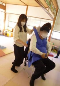 子どもと同じ重さのおもりを付けたパパ達は、階段を上ったり下りたり、寝てみたり…