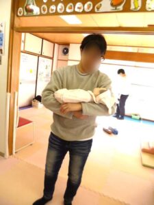 赤ちゃん人形の抱っこは、さすがパパさん達!!手慣れたもので