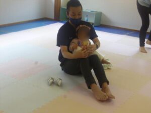 先生が参加した1歳児をひざにのせ、足の指の訓練方法を実践しながらおしえてくれたり、良い靴の選び方を具体的に説明をしてくれました。