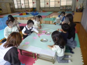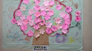 3月の季節にちなんで、さくらの折り紙にお絵描きをしてから、