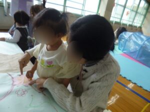 好きな色のクレヨンを選んで描いたり、親子でお話ししながら