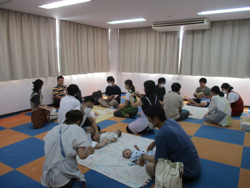 生後1カ月~4カ月の赤ちゃんとパパさんが参加してくださいました。身体測定・手形足形アート作り・記念写真とイベントを楽しんでいただきました。また、グループに分かれてパパ同士の交流会や、助産師さんを交えての育児相談など、充実した時間を過ごしていただきました。