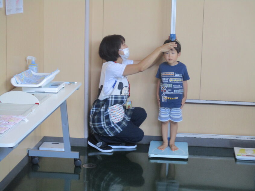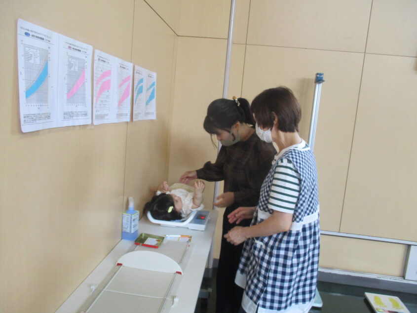 2歳児以上のお子さんは、身長計にかかと、背中、頭をしっかりつけて上手に計測できるお子さんが多かったです☆ 0.1歳児さんは泣いてしまうお子さんが多く、それにつられて、広場のあちらこちらでかわいい泣き声が…。しかし、お母さんたちは上手にあやして下さり、スタッフと協力して、スムーズに計測することが出来ました! 発育曲線を見ながら、お子さんの成長を実感できたようです。