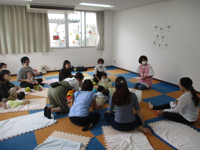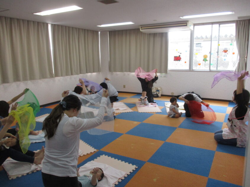 定員の8組全員参加され、1組お父さんも参加されました!今回の親子制作は『ホースのきらきらラトル』を作っていただき、ビーズがこぼれないよう気を付けながら、皆さんとても上手に作って下さいました!! そのあと『オーガンジー遊び』をし、カラフルでふわふわのオーガンジーを使い、お歌に合わせて色んな遊びをしました。手の中からもこもこと出てくるオーガンジーに驚いて泣いてしまうお子さん、手で触りやわらかい感触を楽しむお子さん、様々でした。『おしゃべりたいむ』では、日頃のお困りごとなどを保護者の方同士でお話しました。いろいろなお話をすることで思いを共感し、保護者の方同士の交流も深められていました♪ 温かい雰囲気の「0歳児はぐはぐ広場」でした♡