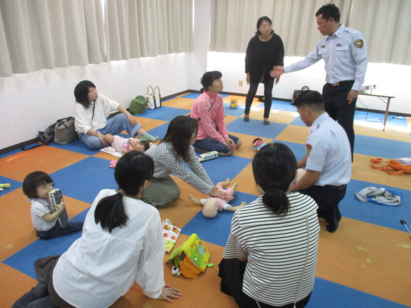 映像を観ながら誤飲や火傷などの処置の仕方を教えていただき、心肺蘇生法、人工呼吸、AEDの操作を実践していただきました。みなさん、とても熱心に講座に参加していただきました。質問をたくさんされたり、有意義な時間を過ごしていただけて良かったです。