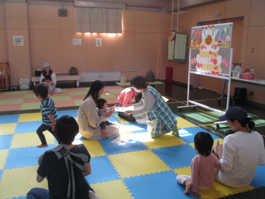 10月生まれのお子さんをみんなでお祝いしました。10月生まれのお子さんがたくさん来て下さり、両日で13名のお子さんのお祝いをしました。参加者全員で、大きなバースデーケーキに果物のデコレーションをしたり、お誕生月のお子さんにはカードとワッペンのプレゼントを渡したり、午前は賑やかな午後は落ち着いたバースデーたいむとなりました。「皆さんにお祝いしてもらえて嬉しかったです!」と喜んで頂けました♪
