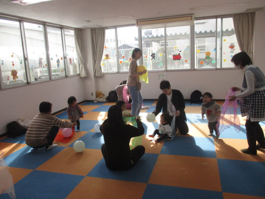 体調不良等で参加できなかった方々もおり、6組の参加となりました。始めから和やかな雰囲気で、かわいい「サンタさんの紙コップベル」を作ったり、「風船ボール」で遊んだり、「おしゃべりたいむ」でお母さん方とスタッフでいろんな子育てに関するお話をしました。笑い声の絶えない楽しい時間となりました♪