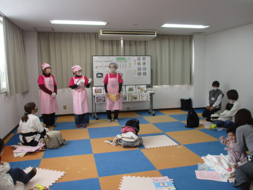 0歳児のお子さんとそのお母さんの参加が多く、皆さん熱心にお話を聞かれていました。月齢に応じた離乳食の与え方、順調に進まない時の対処の仕方などのお話があり、皆さん「なるほど!」という様子でお話を聞かれていました。食生活推進委員協議会の皆さんに出汁の取り方を教わり、最後に作っていただいた御出汁をおいしくいただきました。