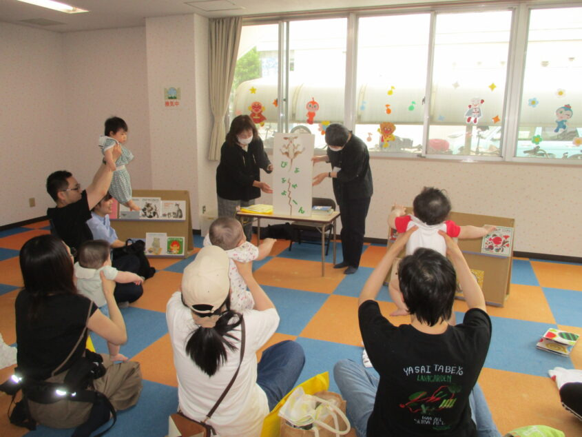7組のお子さんと保護者の方が参加されました。ブックスタートのお話のあと、みんなで大型絵本、2グループに分かれて司書さんと読み聞かせボランティアさんが、3冊ずつ絵本を読んで下さいました✨ 親子のふれあいの時間に、今回お配りした絵本を是非ご活用下さいね♡