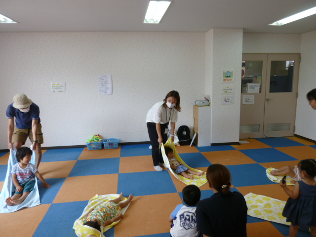 今川学園キンダーハイムの先生と手遊びや触れ合い遊びをして親子で一緒に遊びました。また、シーツ遊び(自宅で遊べる物を使っての遊び)を体験し、「ちょっと怖いなぁ…」「楽しい!」など、お子さん達の反応は様々でした。講座の後には講師の先生にお子さんの発達についての相談や質問タイムがあり、お話をされてスッキリされたようでした。