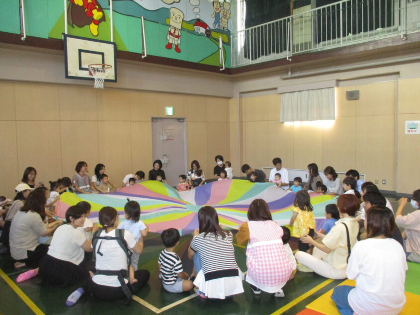 今月のおたのしみたいむは、パラバルーンあそびを行いました。0歳から5歳のお子さん、そしてお父さんお母さん、たくさんの方が参加して下さいました。大きなパラバルーンをみんなでパタパタしたり、中に入ってみたり、最後は『さんぽ』の曲に合わせてパラバルーンあそびを楽しみました♪ 大きなパラバルーンに驚いているお子さんもいましたが、親子さんの嬉しそうな笑顔をたくさん見ることができました。
