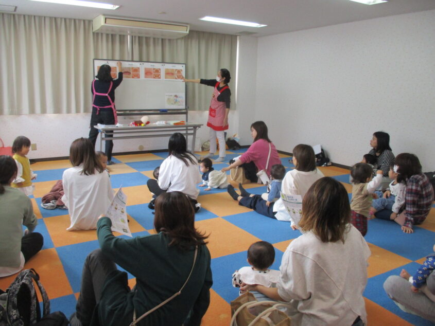 10組24名の方が参加で、0,1歳の小さいお子さんの参加が多く、成長段階にそって丁寧にお話して下さいました。歯みがき前にできるふれあい遊びも教えていただきました✨ 今日教えて頂いた歯みがき方法を、お家でも実践できるといいですね♪