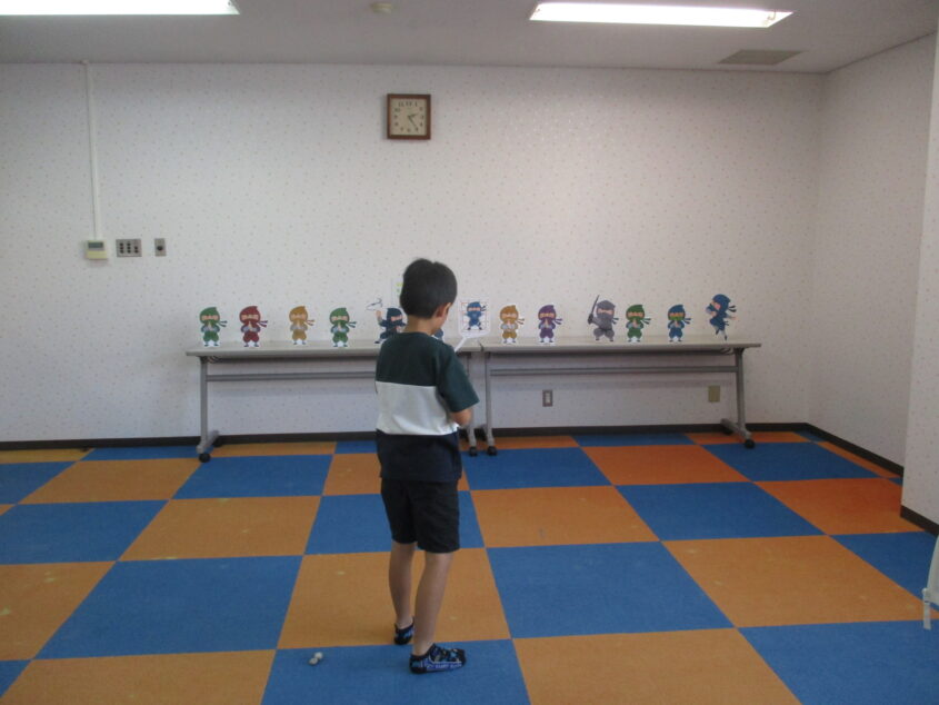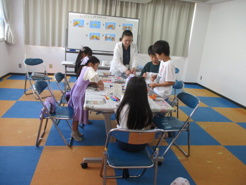 児童達は風船鉄砲の玉作りには新聞紙を力いっぱい固く丸めるのに苦戦していました。見本の大きさに仕上がり紙コップには自分が好きな絵を描き完成。的を幾つ倒せるか個人戦、チーム戦で行い優勝したチームの児童からは「やったぁ~!」と歓声が上がり楽しいイベントでした。
