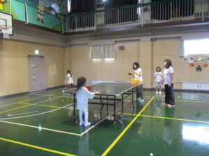 高学年の子どもたちは、膝を使って前へ押し出すように打つことや、バックハンドを教えてもらいました!低学年の子どもたちは、1対1で球をコートに打ち返す練習をしました!みんな真剣に打ち、講師の方に褒められると嬉しそうにしていました☆