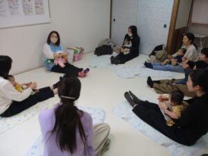 6組の親子さんたちが参加してくださいました✨ サイコロを振っての自己紹介。「今、おもいっきり自分をほめてあげて!」「得意料理を教えて!」など、何がでるか、ドキドキしながらも、皆さん楽しそうな笑顔で始まりました! 3か月~9か月のお子さんと保護者の方が参加して下さり、わらべうたの「ふれあい遊び」や、子育てについていろいろお話をする「おしゃべりたいむ」を行いました。離乳食のお話や、子ども乗せ自転車のお話などいろいろなお話で、盛り上がりました♪ 同じ0歳児の保護者さん同士で会話が弾み、とても有意義な時間となったようでした♡