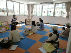 6組のお子さんと保護者の方が参加されました。住吉図書館の館長さんやボランティアさんが来て下さり、ブックスタートのお話やクループに分かれての読み聞かせをしてもらいました。お子さんたちは、ご機嫌でじーっと絵本をみて時折、手足を動かしたりして反応していました♡絵本を通して、親と子の関わりをお楽しみください。