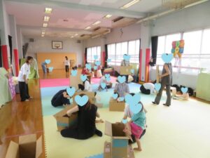 大小いろんな大きさの段ボールを使って、キャタピラ遊びやかくれんぼ、電車ごっこにトンネル、段ボール積み木など思い思いに楽しみました♪