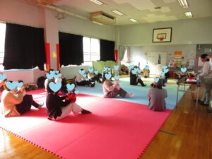 音楽に合わせてゆらゆら~、音が止まると「あれ?」とお顔をのぞき込む。音楽を聞いて即時に反応する事で、集中力・聞く力・想像力・表現力が養われるそうです。