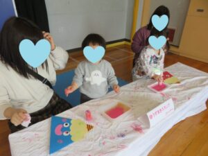 大きな模造紙に思いっきり絵具やクレパスでお絵描きができるコーナーも作り、家ではなかなか出来ないダイナミックなお絵描きを楽しんでもらいました。
