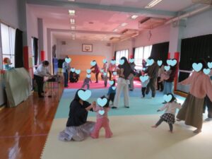 「せつぶん」の音楽♪鬼はそと~福はうち~に合わせてリズム遊びをしたり冬らしい「こそれこすれ」の音楽に合わせてふれあい遊びを楽しみました。