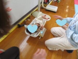 つどいの広場で遊びながら「大きくなったかな?」とみなさん計測に参加されていました。